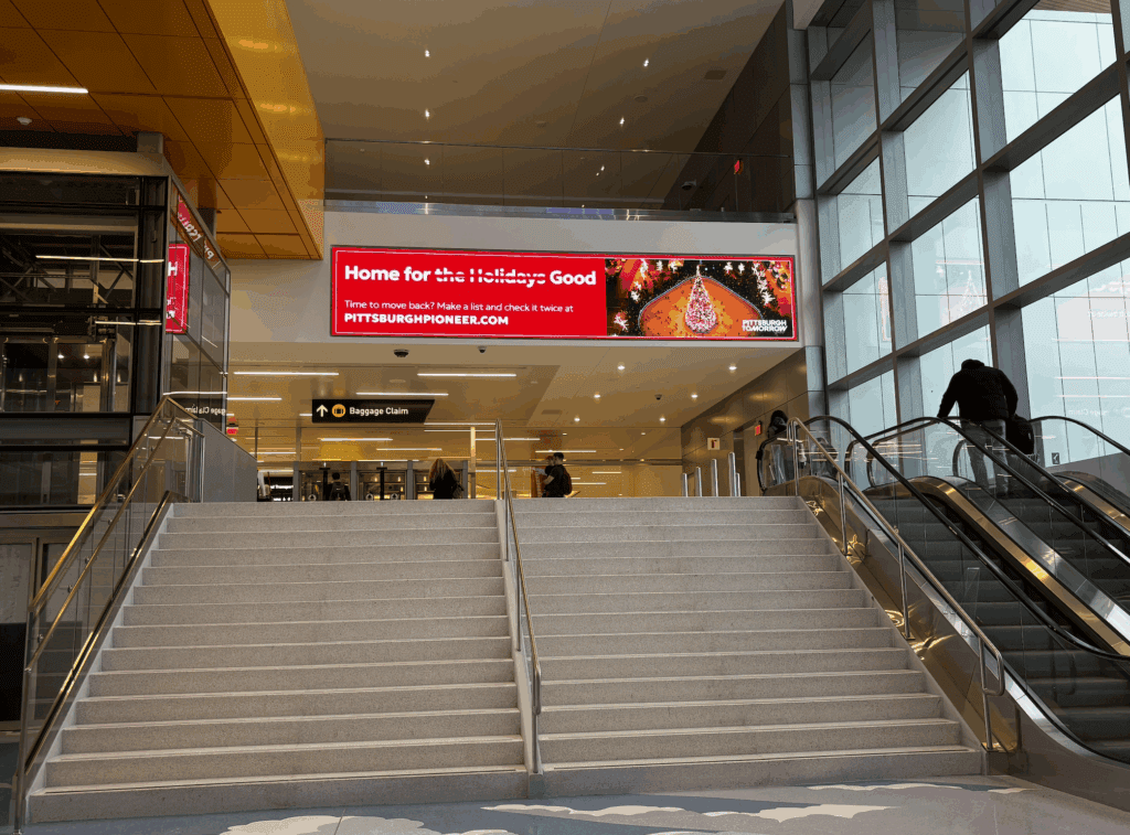 Featuring bold billboards placed throughout Pittsburgh International Airport and along every major highway into the city, the campaign playfully reframes a familiar phrase: “Home for the Holidays” — with the holidays crossed out and replaced by “good.” The message is simple: maybe this visit home doesn’t have to end.